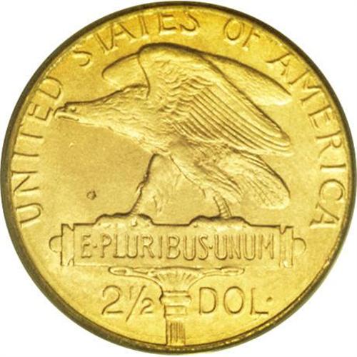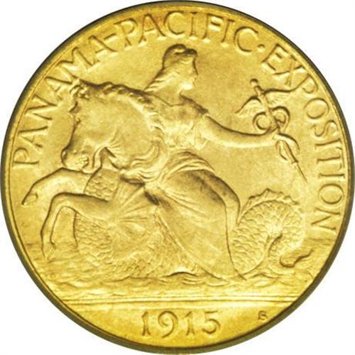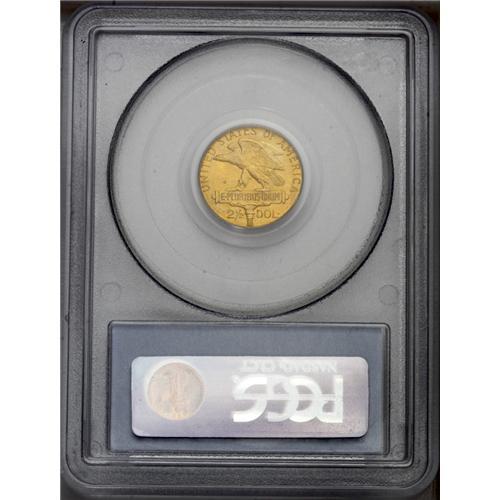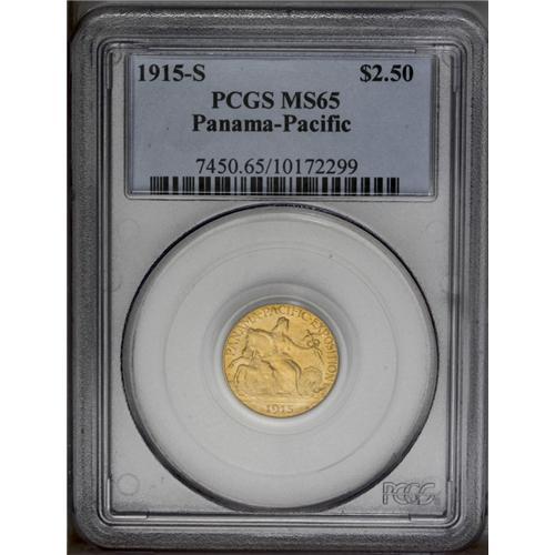 <B>1915-S<$2 1/2> Panama-Pacific Quarter Eagle MS65 PCGS.</B></I> A small pinscratch on Liberty's thighs is basically visible only as a luster break, but it probably restrains an MS66 grade. This piece is nonetheless an attractive Gem coin, with satiny peach-gold surfaces that are otherwise unimpaired.