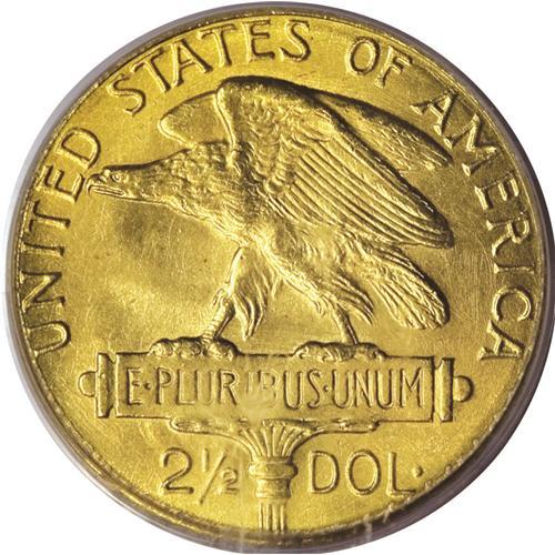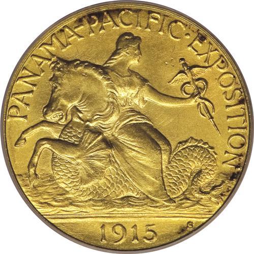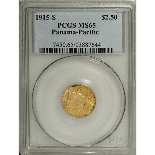 <B>1915-S $2 1/2 Panama-Pacific Quarter Eagle MS65 PCGS.</B></I> The surfaces show few mentionable abrasions with mellow orange-gold coloration. A couple of small dark areas near the periphery appear to be alloy spots from improper working of the copper-gold alloy, as made, and do not affect the technical grade.<BR><BR><b>Shipping:</b> Coins & Currency (<a target="_blank" href="http://www.heritageauctions.com/common/shipping.php">view shipping information</a>)