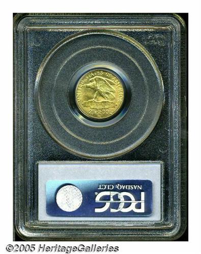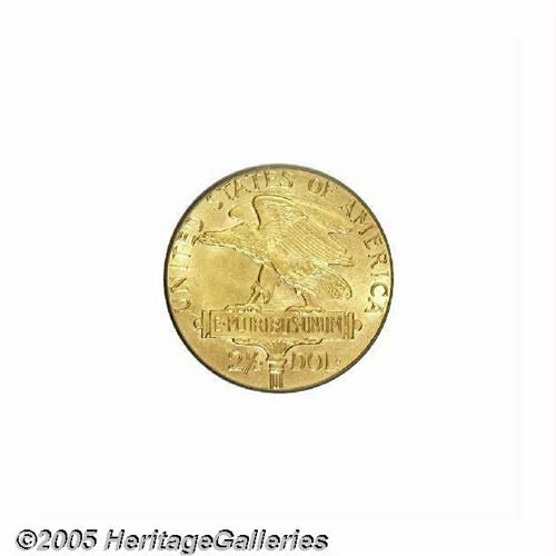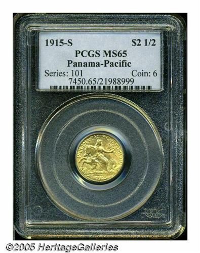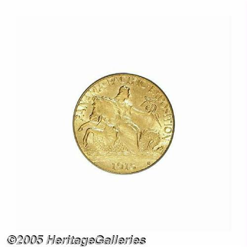 <B>1915-S<$2 1/2> Panama-Pacific Quarter Eagle MS65 PCGS.</B></I> The Pan-Pac quarter eagle undoubtedly has one of the most interesting designs in all of U.S. numismatics. It is also one of the most coveted of all the commemorative gold coins, with MS65 and better pieces especially challenging. This example displays warm peach-gold patina over highly lustrous surfaces. A couple of luster grazes beneath Liberty's outstretched left arm are of no consequence, but mentioned only for accuracy. The motifs reveal sharp impressions throughout. This coin is sure to please the most discerning gold commemorative specialist.