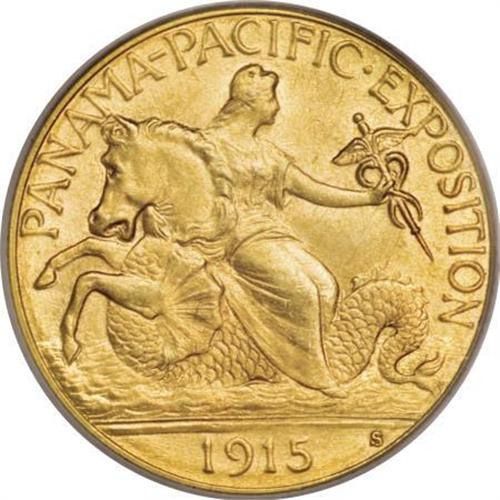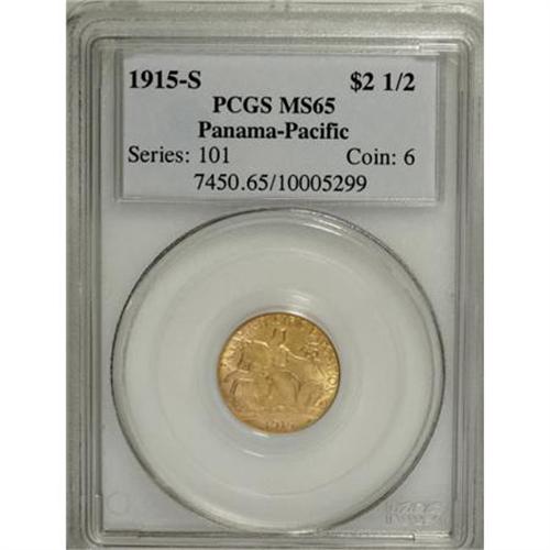 <B>1915-S $2 1/2 Panama-Pacific Quarter Eagle MS65 PCGS.</B></I> Part of the important gold set issued for the Panama-Pacific Exposition, the gold quarter eagle was issued to the extant of just 6,749 coins. While survivors are rather plentiful in all grades, they remain at high levels of popularity and desirability. This lovely Gem is fully brilliant and highly lustrous with delightful light yellow-gold surfaces.<BR><BR><b>Shipping:</b> Coins & Currency (<a target="_blank" href="http://www.heritageauctions.com/common/shipping.php">view shipping information</a>)