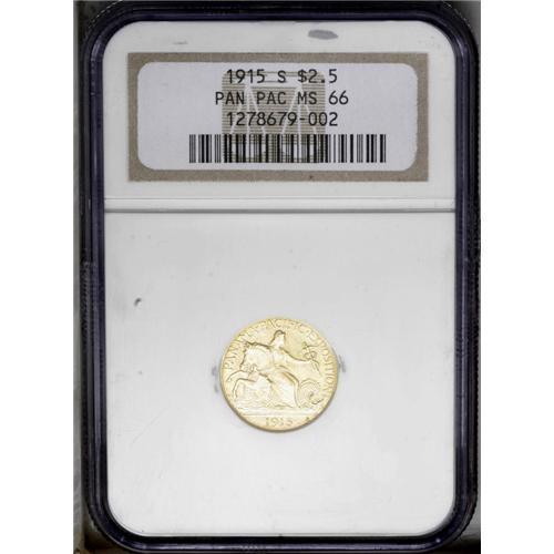 <B>1915-S<$2 1/2> Panama-Pacific Quarter Eagle MS66 NGC.</B></I> Especially bright and lustrous in the fields and attractive. The strike is better than average with most of the details present on Liberty's head. In this lofty grade there are few abrasions, and the eye appeal has to be strong to merit such attention from NGC. A very popular coin with collectors for the fanciful design elements. <BR><BR><B>Important notice:</B> Heritage usually auctions material at the rate of 200-250 lots per hour. On some occasions eBay Live bid software or the Internet may not be able to keep up with the pace of the auction. We recommend placing a realistic absentee bid now as insurance to avoid disappointment. Occasionally the auctioneer may eliminate or reject an eBay Live bid, and the auctioneer may also reopen a lot after the close of the eBay live bidding (usually because we missed an audience bid), and may reject your bid even if it shows you as the winning bidder. By bidding via eBay Live, you agree that Heritage may award the lot to another bidder at its sole discretion under the circumstances described above or any other reasonable circumstances. Since eBay bids are not shown to us until we open the lot on the floor, we treat those bids just like floor bids. In most cases the floor responds before the eBay bid is presented to us, due to Internet lag time, so for consistency we have made it a policy that floor bids are always considered first over tie eBay live bids. Also please note that all Heritage lots purchased through eBay Live carry a 20% Buyer's Premium. Please make sure you read the Terms and Conditions before you bid. This lot is being auctioned in conjunction with a live floor auction by Heritage Galleries & Auctioneers. All final auction and invoice information will be supplied by Heritage Galleries & Auctioneers, and all other information should be considered preliminary. Lot:5171 <BR><BR><B>Winning Notification and Billing:</B> After the FINAL session in this auction is complete, Heritage will send e-mail and snail mail invoices. This process normally takes several days. All final auction and invoice information will be supplied by Heritage Galleries & Auctioneers, and all other information should be considered preliminary. <BR><BR>This auction will be conducted on a live auction floor and over the Internet through eBay Live. If you choose to place an absentee bid, please take a moment to <font color='#0000ff'><u><a href='http://pages.ebay.com/liveauctions/help/before/laabsentee.html'>learn how eBay Live absentee bidding works</a></u></font><font color='#000000'>