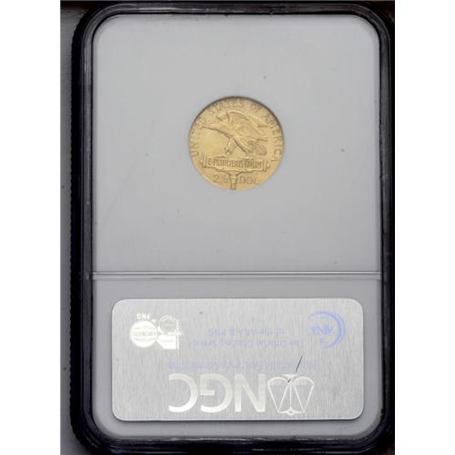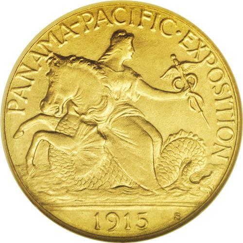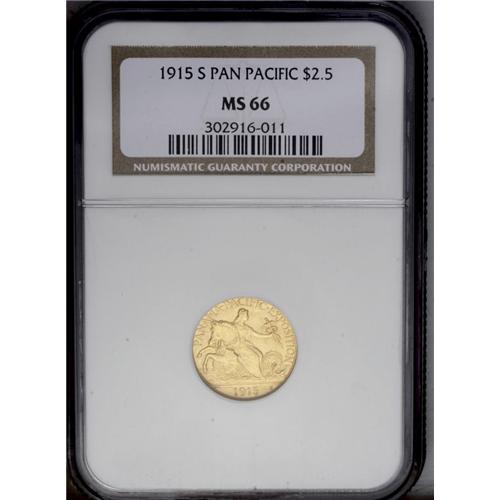 <B>1915-S<$2 1/2> Panama-Pacific Quarter Eagle MS66 NGC.</B></I> This is a remarkable example of the Panama-Pacific quarter eagle with reasonably sharp design elements on both sides. The surfaces are fully brilliant with satiny yellow-gold luster created by extensive die polishing lines in the fields.
