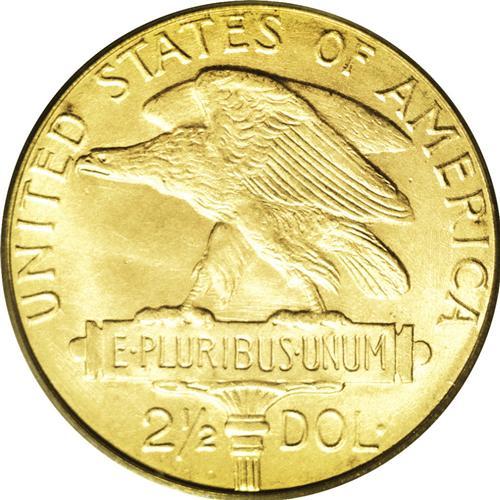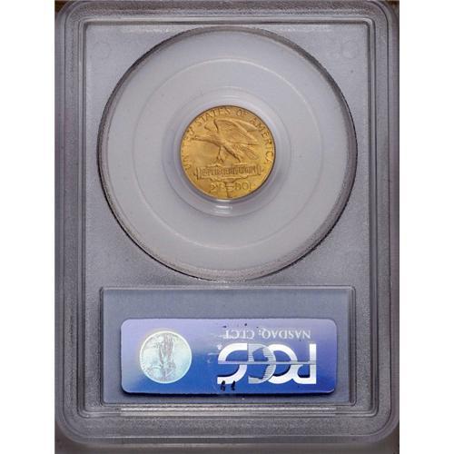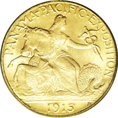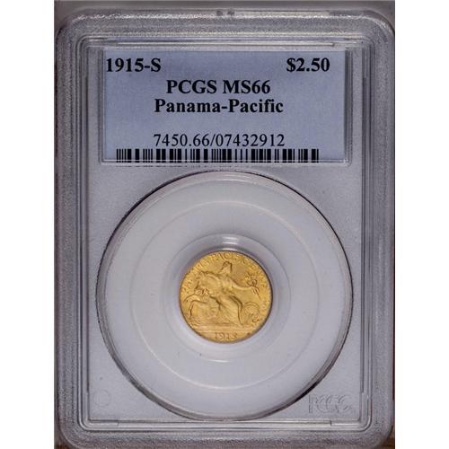 <B>1915-S<$2 1/2> Panama-Pacific Quarter Eagle MS66 PCGS.</B></I> Designed by Charles E. Barber, the obverse of the Panama-Pacific quarter eagle displays Columbia riding on the back of a hippocampus. In her hand, the goddess holds a caduceus that symbolizes Colonel Gorgas' triumph over the malaria and yellow fever epidemics. The reverse is the work of George T. Morgan and its powerful striding eagle represents the necessity of keeping the Panama Canal open during World War I.<BR> A conditionally challenging gold commemorative, the present Gem boasts rich, green-gold and orange-gold coloration over satiny surfaces. Both sides show pleasing definition for the issue. As befits the grade, neither the devices nor the fields reveal any distracting abrasions. This gorgeous survivor should elicit strong bids from dedicated commemorative collectors.