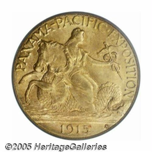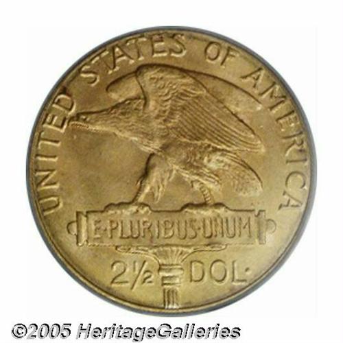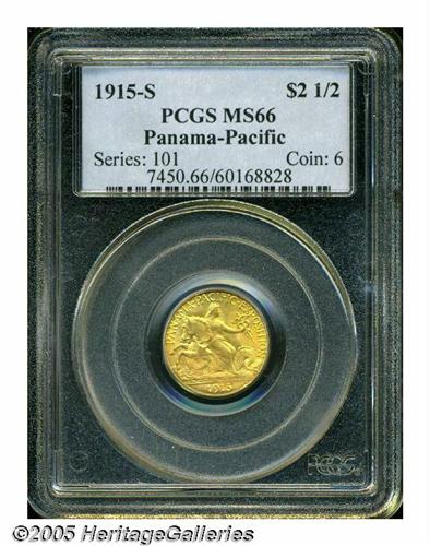 <B>1915-S<$2 1/2> Panama-Pacific Quarter Eagle MS66 PCGS.</B></I> One of the traditional keys to the commemorative gold series (disregarded the $50 issues) and an outstanding, satiny representative accented in delicate orange and steel-blue patina. We cannot even imagine an appreciably finer example.