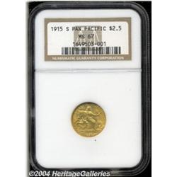 <table><tr><td><TABLE cellSpacing=0 cellPadding=0 width="100%" bgColor=#000000 border=0><TBODY> <TR><TD width="100%"><TABLE cellSpacing=1 cellPadding=3 width="100%" border=0><TBODY><TR><TD width="100%" bgColor=#79735c><FONT face=arial color=#ffffff size=3><B>Description</B> </FONT></TD></TR><TR><TD width="100%" bgColor=#ffffff><FONT face=arial size=2><B>1915-S $2 1/2 Panama-Pacific Quarter Eagle MS67 NGC.</B></I> A magnificent example of this scarce commemorative gold coin. The rich yellow-gold surfaces show just the slightest accent of light rose patina. Close examination shows myriad die polishing lines on each side, but as far as out-of-mint defects those are limited to two tiny marks below the eagle's neck on the reverse. Superior overall quality. Population: 59 in 67, 0 finer (2/04). </FONT></TD></TR></TBODY></TABLE></TD></TR></TBODY></TABLE><BR><A name=PricesRealized></A><TABLE cellSpacing=0 cellPadding=0 width="100%" bgColor=#000000 border=0><TBODY><TR><TD width="100%"><TABLE cellSpacing=1 cellPadding=3 width="100%" border=0><TBODY><TR><TD width="100%" bgColor=#79735c><A name=PR><FONT face=arial color=#ffffff size=3><B>Previous Prices from Heritage Auctions</B> </FONT></A></TD></TR><TR><TD bgColor=#f6f6ed><TABLE cellSpacing=0 cellPadding=0 width="100%" border=1><TBODY><TR><TD align=middle width="33%"><B>Date</B></TD><TD align=middle width="33%"><B>Service</B></TD><TD align=middle width="33%"><B>Price</B></TD></TR><TR bgColor=whitesmoke><TD width="33%"><B>01/11/2003</B></TD><TD width="33%">PCGS</TD><TD width="33%">$10,062.50</TD></TR><TR bgColor=whitesmoke><TD width="33%"><B>02/11/2000</B></TD><TD width="33%">PCGS</TD><TD width="33%">$10,637.50</TD></TR><TR bgColor=whitesmoke><TD width="33%"><B>01/10/1998</B></TD><TD width="33%">NGC</TD><TD width="33%">$10,062.50</TD></TR></TBODY></TABLE></TD></TR><TR><TD bgColor=#ffffff><FONT face=arial size=1 ?>PLEASE NOTE: All prices realized reflect the final hammer price PLUS the buyer's premium in auctions that charge a buyer's premium. Each item has a notation at the top of the listing indicating whether that lot included a buyer's premium. Example: A item that sells with a final hammer price of $100 and a 20% buyer's premium will display with a price realized of $120. All information listed is intended to be as accurate as possible, but errors are possible. Please use this guide carefully and inform us of any inaccuracies. </FONT></TD></TR></TBODY></TABLE></TD></TR></TBODY></TABLE><BR><TABLE cellSpacing=0 cellPadding=0 width="100%" bgColor=#000000 border=0><TBODY><TR><TD width="100%"><TABLE cellSpacing=1 cellPadding=3 width="100%" border=0><TBODY><TR><TD width="100%" bgColor=#79735c colSpan=6><FONT face=arial color=#ffffff size=3><B>Price Guide*</B> </FONT></TD></TR><TR bgColor=#f6f6ed><TD align=middle><B>Grade</B> </TD><TD align=middle><B>Coin World<BR>(Trends)</B> </TD><TD align=middle><B>Numismedia<BR>Retail</B> </TD><TD align=middle><B>Numismedia<BR>Wholesale</B> </TD><TD align=middle><B>Coin<BR>Universe</B> </TD><TD align=middle><B>Heritage<BR>Value Index</B> </TD></TR><TR bgColor=#ffffff><TD align=middle>66</TD><TD align=right>$8,000.00</TD><TD align=right>---</TD><TD align=right>$5,175.00</TD><TD align=right>$6,750.00</TD><TD align=right>$5,214.38</TD></TR><TR style="FONT-WEIGHT: bold" bgColor=#cccfdd><TD align=middle>67</TD><TD align=right>$15,000.00</TD><TD align=right>---</TD><TD align=right>$13,050.00</TD><TD align=right>$15,000.00</TD><TD align=right>$9,766.67</TD></TR><TR bgColor=#ffffff><TD align=middle>68</TD><TD align=right>---</TD><TD align=right>---</TD><TD align=right>---</TD><TD align=right>---</TD><TD align=right>---</TD></TR><TR bgColor=#ffffff><TD colSpan=6><FONT size=1>*All information listed is intended to be as accurate as possible, but errors are possible. No item may be returned or refused based on this information which is provided as a service to our customers. You should contact each pricing source directly to determine the accuracy of this information. </FONT></TD></TR></TBODY></TABLE></TD></TR></TBODY></TABLE><BR><TABLE cellSpacing=0 cellPadding=0 width="100%" bgColor=#000000 border=0><TBODY><TR><TD width="100%"><TABLE cellSpacing=1 cellPadding=3 width="100%" border=0><TBODY><TR><TD width="100%" bgColor=#79735c><FONT face=arial color=#ffffff size=3><B>Population Guide</B> </FONT></TD></TR><TR bgColor=#ffffff><TD align=middle><!-- Begin Output of Population Grid--><TABLE cellSpacing=0 cellPadding=0 width="100%" border=0><TBODY><TR><TD vAlign=center><TABLE cellSpacing=0 width="100%" border=1 cellsadding="3"><TBODY><TR><TD vAlign=center><TABLE cellSpacing=0 cellPadding=3 width="100%" border=1><TBODY><TR><TD vAlign=center align=middle bgColor=#f0f1e8 colSpan=2 <CENTER><FONT face=Arial size=2><B>PCGS Pop </B></FONT><CENTER></CENTER></TD><TD vAlign=center align=middle bgColor=#f0f1e8 colSpan=2><CENTER><FONT face=Arial size=2><B>NGC Pop</B></CENTER></FONT></TD></TR><TR><TD vAlign=center><FONT face=Arial size=2>(67)</FONT> </TD><TD vAlign=center align=right><FONT face=Arial size=2>13</FONT> </TD><TD vAlign=center><FONT face=Arial size=2>(67)</FONT> </TD><TD vAlign=center align=right><FONT face=Arial size=2>68</FONT> </TD></TR><TR><TD vAlign=center><FONT face=Arial size=2>(>67)</FONT> </TD><TD vAlign=center align=right><FONT face=Arial size=2>0</FONT> </TD><TD vAlign=center><FONT face=Arial size=2>(>67)</FONT> </TD><TD vAlign=center align=right><FONT face=Arial size=2>0</FONT> </TD></TR></TBODY></TABLE></TD></TR></TBODY></TABLE></TD></TR></TBODY></TABLE><!-- End Output of Population Grid--></TD></TR></TBODY></TABLE></TD></TR></TBODY></TABLE><BR><TABLE cellSpacing=0 cellPadding=0 width="100%" bgColor=#000000 border=0><TBODY><TR> <font color='#000000'><span style='background-color: #FFFFFF'><td bgcolor='#FFFFFE'> Important notice: Heritage usually auctions material at the rate of 200-250 lots per hour. On some occasions eBay Live bid software or the Internet may not be able to keep up with the pace of the auction. We r