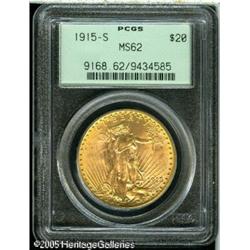 <B>1915-S $20 MS62 PCGS.</B></I> Well struck with pleasing, softly frosted luster, lovely apricot-orange and scattered light steel-gray color, and a paucity of marks, for the grade. An attractive Mint State example of this lower-mintage San Francisco issue. Lot:9573