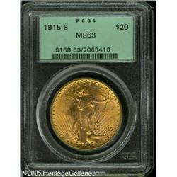 <B>1915-S $20 MS63 PCGS.</B></I> This lustrous Double Eagle features attractive lemon-gold color and is not unduly marked. Housed in a green label holder. Lot:9574