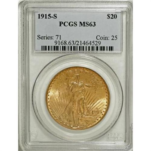 <B>1915-S $20 MS63 PCGS.</B></I> PCGS Population (3273/5014). NGC Census: (4459/6465). Mintage: 567,500. Numismedia Wsl. Price for NGC/PCGS coin in MS63: $950. (#9168)<BR><BR><B>Coin Engraver:</B> Augustus Saint-Gaudens<BR><BR><b>Shipping:</b> Coins & Currency (<a target="_blank" href="http://www.heritageauctions.com/common/shipping.php">view shipping information</a>)