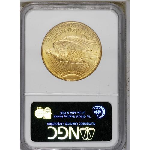 <B>1915-S<$20> MS64 NGC.</B></I> Lemon-yellow accents appear on each side of this orange-gold near-Gem. Nicely struck with attractive luster and few marks for the grade.