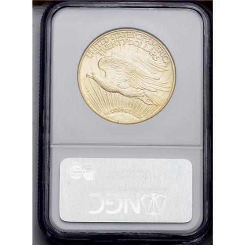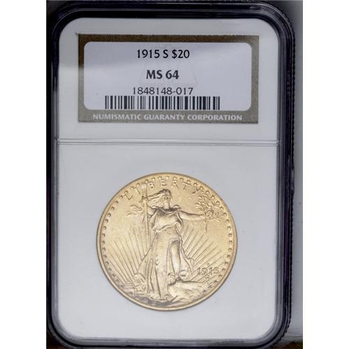 <B>1915-S<$20> MS64 NGC.</B></I> Radiant luster enlivens apricot-gold surfaces that display sharply struck design features. A few minor obverse marks limit the grade.