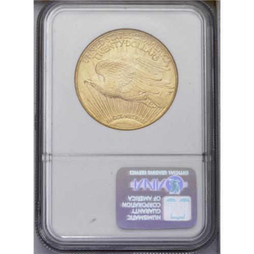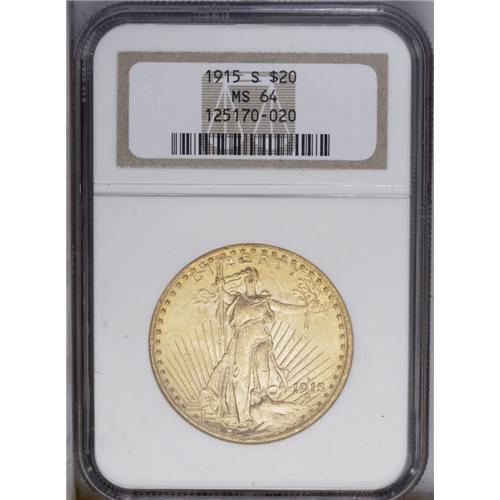 <B>1915-S<$20> MS64 NGC.</B></I> This lustrous khaki-gold Choice Saint-Gaudens twenty is clean save for a thin mark on the eagle's leg and a lamination on the BE in LIBERTY. <BR><BR><B>Important notice:</B> Heritage usually auctions material at the rate of 200-250 lots per hour. On some occasions eBay Live bid software or the Internet may not be able to keep up with the pace of the auction. We recommend placing a realistic absentee bid now as insurance to avoid disappointment. Occasionally the auctioneer may eliminate or reject an eBay Live bid, and the auctioneer may also reopen a lot after the close of the eBay live bidding (usually because we missed an audience bid), and may reject your bid even if it shows you as the winning bidder. By bidding via eBay Live, you agree that Heritage may award the lot to another bidder at its sole discretion under the circumstances described above or any other reasonable circumstances. Since eBay bids are not shown to us until we open the lot on the floor, we treat those bids just like floor bids. In most cases the floor responds before the eBay bid is presented to us, due to Internet lag time, so for consistency we have made it a policy that floor bids are always considered first over tie eBay live bids. Also please note that all Heritage lots purchased through eBay Live carry a 20% Buyer's Premium. Please make sure you read the Terms and Conditions before you bid. This lot is being auctioned in conjunction with a live floor auction by Heritage Galleries & Auctioneers. All final auction and invoice information will be supplied by Heritage Galleries & Auctioneers, and all other information should be considered preliminary. Lot:4650 <BR><BR><B>Winning Notification and Billing:</B> After the FINAL session in this auction is complete, Heritage will send e-mail and snail mail invoices. This process normally takes several days. All final auction and invoice information will be supplied by Heritage Galleries & Auctioneers, and all other information should be considered preliminary. <BR><BR>This auction will be conducted on a live auction floor and over the Internet through eBay Live. If you choose to place an absentee bid, please take a moment to <font color='#0000ff'><u><a href='http://pages.ebay.com/liveauctions/help/before/laabsentee.html'>learn how eBay Live absentee bidding works</a></u></font><font color='#000000'>