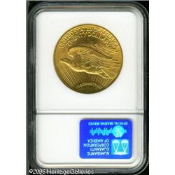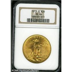 <B>1915-S $20 MS64 NGC.</B></I> Well struck with bright, shimmering surfaces that exhibit attractive, even coloration and a smattering of tiny contact marks on each side. Lot:9583