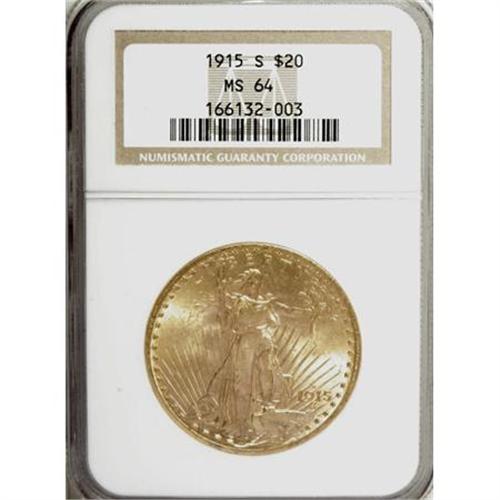 <B>1915-S $20 MS64 NGC.</B></I> NGC Census: (4865/1615). PCGS Population (3238/1813). Mintage: 567,500. Numismedia Wsl. Price for NGC/PCGS coin in MS64: $1,060. (#9168)<BR><BR><B>Coin Engraver:</B> Augustus Saint-Gaudens<BR><BR><b>Shipping:</b> Coins & Currency (<a target="_blank" href="http://www.heritageauctions.com/common/shipping.php">view shipping information</a>)
