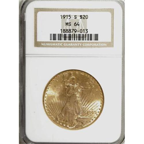 <B>1915-S $20 MS64 NGC.</B></I> NGC Census: (4865/1615). PCGS Population (3238/1813). Mintage: 567,500. Numismedia Wsl. Price for NGC/PCGS coin in MS64: $1,060. (#9168)<BR><BR><B>Coin Engraver:</B> Augustus Saint-Gaudens<BR><BR><b>Shipping:</b> Coins & Currency (<a target="_blank" href="http://www.heritageauctions.com/common/shipping.php">view shipping information</a>)