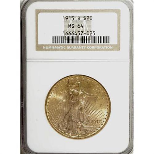 <B>1915-S $20 MS64 NGC.</B></I> NGC Census: (4865/1615). PCGS Population (3238/1813). Mintage: 567,500. Numismedia Wsl. Price for NGC/PCGS coin in MS64: $1,060. (#9168)<BR><BR><B>Coin Engraver:</B> Augustus Saint-Gaudens<BR><BR><b>Shipping:</b> Coins & Currency (<a target="_blank" href="http://www.heritageauctions.com/common/shipping.php">view shipping information</a>)
