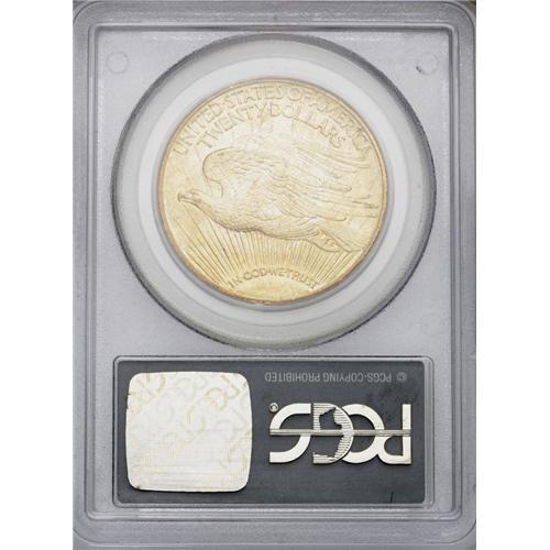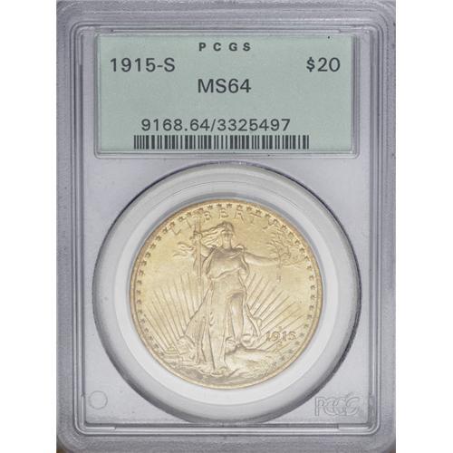 <B>1915-S<$20> MS64 PCGS.</B></I> A honey-gold near-Gem with a crisp strike and vibrant luster. A handling mark or two is concealed on the wings. Encapsulated in a green label holder. <BR><BR><B>Important notice:</B> Heritage usually auctions material at the rate of 200-250 lots per hour. On some occasions eBay Live bid software or the Internet may not be able to keep up with the pace of the auction. We recommend placing a realistic absentee bid now as insurance to avoid disappointment. Occasionally the auctioneer may eliminate or reject an eBay Live bid, and the auctioneer may also reopen a lot after the close of the eBay live bidding (usually because we missed an audience bid), and may reject your bid even if it shows you as the winning bidder. By bidding via eBay Live, you agree that Heritage may award the lot to another bidder at its sole discretion under the circumstances described above or any other reasonable circumstances. Since eBay bids are not shown to us until we open the lot on the floor, we treat those bids just like floor bids. In most cases the floor responds before the eBay bid is presented to us, due to Internet lag time, so for consistency we have made it a policy that floor bids are always considered first over tie eBay live bids. Also please note that all Heritage lots purchased through eBay Live carry a 20% Buyer's Premium. Please make sure you read the Terms and Conditions before you bid. This lot is being auctioned in conjunction with a live floor auction by Heritage Galleries & Auctioneers. All final auction and invoice information will be supplied by Heritage Galleries & Auctioneers, and all other information should be considered preliminary. Lot:4649 <BR><BR><B>Winning Notification and Billing:</B> After the FINAL session in this auction is complete, Heritage will send e-mail and snail mail invoices. This process normally takes several days. All final auction and invoice information will be supplied by Heritage Galleries & Auctioneers, and all other information should be considered preliminary. <BR><BR>This auction will be conducted on a live auction floor and over the Internet through eBay Live. If you choose to place an absentee bid, please take a moment to <font color='#0000ff'><u><a href='http://pages.ebay.com/liveauctions/help/before/laabsentee.html'>learn how eBay Live absentee bidding works</a></u></font><font color='#000000'>