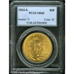 <B>1915-S $20 MS64 PCGS.</B></I> A lemon-gold near-Gem with pleasing luster and clean fields. The strike is quite sharp on Liberty's face and hands. The eagle's neck has a moderate concealed mark. Lot:9582