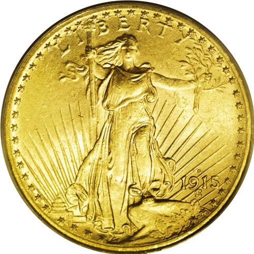 <B>1915-S<$20> MS64 PCGS.</B></I> A solidly struck yellow-orange double eagle. The lustrous surfaces have numerous small marks that influence the technical grade more than the eye appeal.