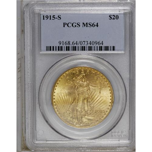 1915-S $20 MS64 PCGS. A solidly struck yellow-orange d