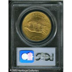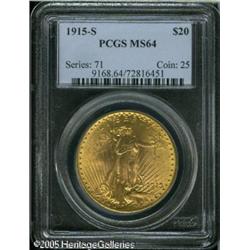<B>1915-S $20 MS64 PCGS.</B></I> Nicely struck, with peach-gold patina over lustrous surfaces. A small mark beneath Liberty's right breast limits the grade. Lot:9580