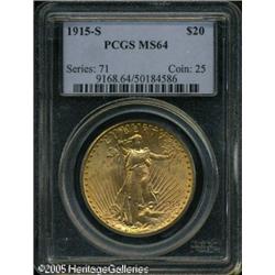 <B>1915-S $20 MS64 PCGS.</B></I> Orange and lime hues embrace this shimmering and meticulously struck near-Gem. The reverse is splendidly preserved aside from minor blemishes on the sun. Lot:9577