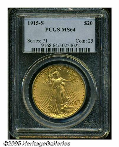 <B>1915-S<$20> MS64 PCGS.</B></I> Pinpoint striking details are immediately evident on this attractive near-Gem. The surfaces also display deep orange-gold coloration and the usual mint luster this date is known for.