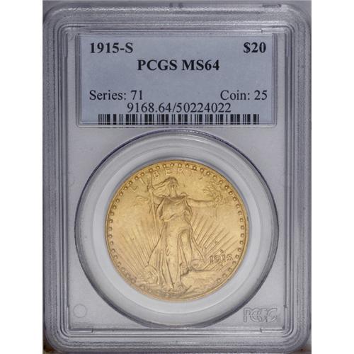 <B>1915-S $20 MS64 PCGS.</B></I> Pinpoint striking details are immediately evident on this attractive near-Gem. The surfaces also display deep orange-gold coloration and the usual mint luster this date is known for.
