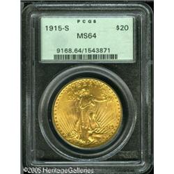 <B>1915-S $20 MS64 PCGS.</B></I> Sharply struck, the matte-like surfaces have a lovely overlay of satiny mint luster. Lot:9578