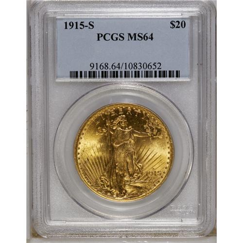<B>1915-S $20 MS64 PCGS.</B></I> Vivid bright yellow color with plenty of luster covers both obverse and reverse of this near Gem level coin. The strike is sharp for this popular S mint coin.<BR><BR><b>Shipping:</b> Coin/Currency (<a target="_blank" href="http://www.heritageauctions.com/common/shipping.php">view shipping information</a>)