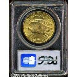 <B>1915-S<$20> MS64 PCGS.</B></I> This specimen is characterized by apricot-gold coloration, nicely struck design elements, and relatively well preserved surfaces. A few light abrasions on each of Liberty's legs are reported for accuracy. <BR><BR><B>Important notice:</B> Heritage usually auctions material at the rate of 200-250 lots per hour. On some occasions eBay Live bid software or the Internet may not be able to keep up with the pace of the auction. We recommend placing a realistic absentee bid now as insurance to avoid disappointment. Occasionally the auctioneer may eliminate or reject an eBay Live bid, and the auctioneer may also reopen a lot after the close of the eBay live bidding (usually because we missed an audience bid), and may reject your bid even if it shows you as the winning bidder. By bidding via eBay Live, you agree that Heritage may award the lot to another bidder at its sole discretion under the circumstances described above or any other reasonable circumstances. Since eBay bids are not shown to us until we open the lot on the floor, we treat those bids just like floor bids. In most cases the floor responds before the eBay bid is presented to us, due to Internet lag time, so for consistency we have made it a policy that floor bids are always considered first over tie eBay live bids. Also please note that all Heritage lots purchased through eBay Live carry a 20% Buyer's Premium. Please make sure you read the Terms and Conditions before you bid. </span></font></tr></table></td></tr></table>