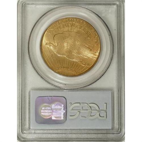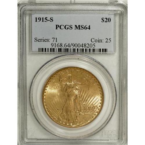 <B>1915-S $20 MS64 PCGS.</B></I> The 1915-S double is a collector favorite because of its quality and availability. Excellent delineation characterizes this near-Gem, as do bright luster and a mix of peach-gold and mint-green coloration. A few minor marks prevent Gem status.<BR><BR><b>Shipping:</b> Coins & Currency (<a target="_blank" href="http://www.heritageauctions.com/common/shipping.php">view shipping information</a>)
