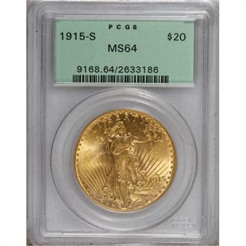 <B>1915-S $20 MS64 PCGS.</B></I> PCGS Population (3052/1698). NGC Census: (4787/1585). Mintage: 567,500. Numismedia Wsl. Price for NGC/PCGS coin in MS64: $840. (#9168)<BR><BR><B>Coin Engraver:</B> Augustus Saint-Gaudens<BR><BR><b>Shipping:</b> Coins & Currency (<a target="_blank" href="http://www.heritageauctions.com/common/shipping.php">view shipping information</a>)