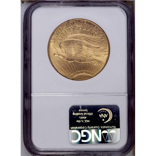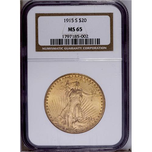 <B>1915-S<$20> MS65 NGC.</B></I> Finely granular surfaces display pleasing luster and are minimally abraded. Excellent definition is seen on the motifs. <BR><BR><B>Important notice:</B> Heritage usually auctions material at the rate of 200-250 lots per hour. On some occasions eBay Live bid software or the Internet may not be able to keep up with the pace of the auction. We recommend placing a realistic absentee bid now as insurance to avoid disappointment. Occasionally the auctioneer may eliminate or reject an eBay Live bid, and the auctioneer may also reopen a lot after the close of the eBay live bidding (usually because we missed an audience bid), and may reject your bid even if it shows you as the winning bidder. By bidding via eBay Live, you agree that Heritage may award the lot to another bidder at its sole discretion under the circumstances described above or any other reasonable circumstances. Since eBay bids are not shown to us until we open the lot on the floor, we treat those bids just like floor bids. In most cases the floor responds before the eBay bid is presented to us, due to Internet lag time, so for consistency we have made it a policy that floor bids are always considered first over tie eBay live bids. Also please note that all Heritage lots purchased through eBay Live carry a 20% Buyer's Premium. Please make sure you read the Terms and Conditions before you bid. This lot is being auctioned in conjunction with a live floor auction by Heritage Galleries & Auctioneers. All final auction and invoice information will be supplied by Heritage Galleries & Auctioneers, and all other information should be considered preliminary. Lot:4653 <BR><BR><B>Winning Notification and Billing:</B> After the FINAL session in this auction is complete, Heritage will send e-mail and snail mail invoices. This process normally takes several days. All final auction and invoice information will be supplied by Heritage Galleries & Auctioneers, and all other information should be considered preliminary. <BR><BR>This auction will be conducted on a live auction floor and over the Internet through eBay Live. If you choose to place an absentee bid, please take a moment to <font color='#0000ff'><u><a href='http://pages.ebay.com/liveauctions/help/before/laabsentee.html'>learn how eBay Live absentee bidding works</a></u></font><font color='#000000'>