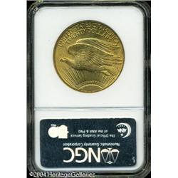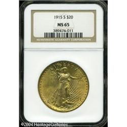 1915-S $20 MS65 NGC. Sharply struck, with lustrous <B>1915-S $20 MS65 NGC.</B></I> Sharply struck, with lustrous peach-gold patina. The surfaces reveal only a few insignificant contact marks. <BR><BR><B>Important notice:</B> Heritage usually auctions material at the rate of 200-250 lots per hour. On some occasions eBay Live bid software or the Internet may not be able to keep up with the pace of the auction. We recommend placing a realistic absentee bid now as insurance to avoid disappointment. Occasionally the auctioneer may eliminate or reject an eBay Live bid, and the auctioneer may also reopen a lot after the close of the eBay live bidding (usually because we missed an audience bid), and may reject your bid even if it shows you as the winning bidder. By bidding via eBay Live, you agree that Heritage may award the lot to another bidder at its sole discretion under the circumstances described above or any other reasonable circumstances. Since eBay bids are not shown to us until we open the lot on the floor, we treat those bids just like floor bids. In most cases the floor responds before the eBay bid is presented to us, due to Internet lag time, so for consistency we have made it a policy that floor bids are always considered first over tie eBay live bids. Also please note that all Heritage lots purchased through eBay Live carry a 20% Buyer's Premium. Please make sure you read the Terms and Conditions before you bid. This lot is being auctioned in conjunction with a live floor auction by Heritage Galleries & Auctioneers. All final auction and invoice information will be supplied by Heritage Galleries & Auctioneers, and all other information should be considered preliminary. Lot:7166