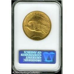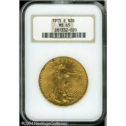 1915-S $20 MS65 NGC. This meticulously struck Sain <B>1915-S $20 MS65 NGC.</B></I> This meticulously struck Saint-Gaudens is splendidly preserved and features full mint bloom. A couple of tiny specks of dark debris along the upper left obverse border confirm the originality. An older holder example. <BR><BR><B>Important notice:</B> Heritage usually auctions material at the rate of 200-250 lots per hour. On some occasions eBay Live bid software or the Internet may not be able to keep up with the pace of the auction. We recommend placing a realistic absentee bid now as insurance to avoid disappointment. Occasionally the auctioneer may eliminate or reject an eBay Live bid, and the auctioneer may also reopen a lot after the close of the eBay live bidding (usually because we missed an audience bid), and may reject your bid even if it shows you as the winning bidder. By bidding via eBay Live, you agree that Heritage may award the lot to another bidder at its sole discretion under the circumstances described above or any other reasonable circumstances. Since eBay bids are not shown to us until we open the lot on the floor, we treat those bids just like floor bids. In most cases the floor responds before the eBay bid is presented to us, due to Internet lag time, so for consistency we have made it a policy that floor bids are always considered first over tie eBay live bids. Also please note that all Heritage lots purchased through eBay Live carry a 20% Buyer's Premium. Please make sure you read the Terms and Conditions before you bid. This lot is being auctioned in conjunction with a live floor auction by Heritage Galleries & Auctioneers. All final auction and invoice information will be supplied by Heritage Galleries & Auctioneers, and all other information should be considered preliminary. Lot:7169