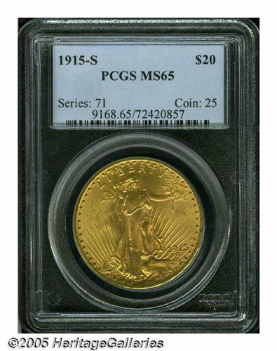 <B>1915-S<$20> MS65 PCGS.</B></I> A true Gem with surfaces that are minimally abraded and flashy in the fields. The strike is also a notable attribute as crisp definition is seen throughout the devices.