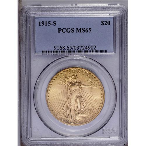 <B>1915-S<$20> MS65 PCGS.</B></I> Boldly struck with a very clean overall appearance and highly lustrous surfaces that are minimally marked. A nicely struck double eagle with considerable aesthetic appeal.