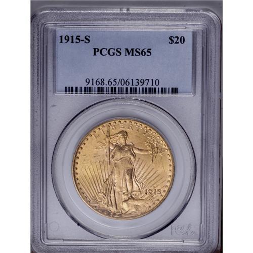 <B>1915-S<$20> MS65 PCGS.</B></I> Both sides of this well preserved example display an appealing reddish tint and only a few modest abrasions are seen over the devices. <BR><BR><B>Important notice:</B> Heritage usually auctions material at the rate of 200-250 lots per hour. On some occasions eBay Live bid software or the Internet may not be able to keep up with the pace of the auction. We recommend placing a realistic absentee bid now as insurance to avoid disappointment. Occasionally the auctioneer may eliminate or reject an eBay Live bid, and the auctioneer may also reopen a lot after the close of the eBay live bidding (usually because we missed an audience bid), and may reject your bid even if it shows you as the winning bidder. By bidding via eBay Live, you agree that Heritage may award the lot to another bidder at its sole discretion under the circumstances described above or any other reasonable circumstances. Since eBay bids are not shown to us until we open the lot on the floor, we treat those bids just like floor bids. In most cases the floor responds before the eBay bid is presented to us, due to Internet lag time, so for consistency we have made it a policy that floor bids are always considered first over tie eBay live bids. Also please note that all Heritage lots purchased through eBay Live carry a 20% Buyer's Premium. Please make sure you read the Terms and Conditions before you bid. This lot is being auctioned in conjunction with a live floor auction by Heritage Galleries & Auctioneers. All final auction and invoice information will be supplied by Heritage Galleries & Auctioneers, and all other information should be considered preliminary. Lot:4651 <BR><BR><B>Winning Notification and Billing:</B> After the FINAL session in this auction is complete, Heritage will send e-mail and snail mail invoices. This process normally takes several days. All final auction and invoice information will be supplied by Heritage Galleries & Auctioneers, and all other information should be considered preliminary. <BR><BR>This auction will be conducted on a live auction floor and over the Internet through eBay Live. If you choose to place an absentee bid, please take a moment to <font color='#0000ff'><u><a href='http://pages.ebay.com/liveauctions/help/before/laabsentee.html'>learn how eBay Live absentee bidding works</a></u></font><font color='#000000'>