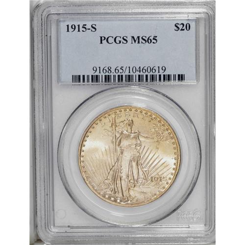 <B>1915-S<$20> MS65 PCGS.</B></I> Hints of orange are visible near the rims of this straw-gold Gem. Sharply struck with flashy luster and remarkably clean surfaces for the grade.