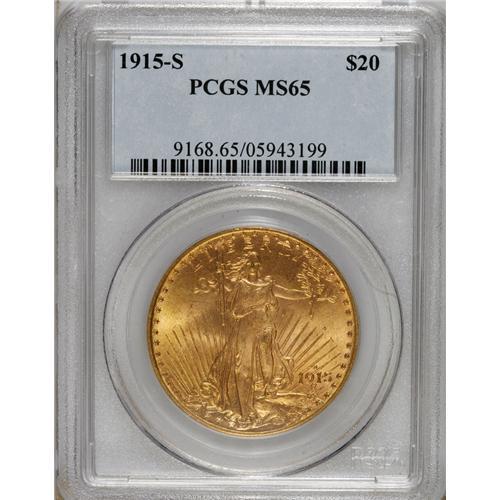 <B>1915-S $20 MS65 PCGS.</B></I> Somewhat soft on the torch flame, but boldly struck elsewhere, with matte-like surfaces and shimmering luster. A few wispy marks are noted, but they are not excessive for the Gem grade designation.<BR><BR><b>Shipping:</b> Coins & Currency (<a target="_blank" href="http://www.heritageauctions.com/common/shipping.php">view shipping information</a>)