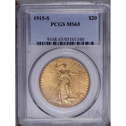 <B>1915-S<$20> MS65 PCGS.</B></I> This attractive Gem displays lustrous red-gold surfaces that are conspicuous by their lack of abrasions. A nicely struck coin with considerable aesthetic appeal.