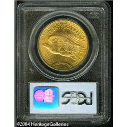 1915-S $20 MS65 PCGS. This impressive Gem features <B>1915-S $20 MS65 PCGS.</B></I> This impressive Gem features rich peach-gold color. The booming cartwheel luster fails to reveal any grade-limiting marks. A small mint-made planchet flaw is northeast of the mintmark, and a few miniscule flyspecks do not diminish the eye appeal. <BR><BR><B>Important notice:</B> Heritage usually auctions material at the rate of 200-250 lots per hour. On some occasions eBay Live bid software or the Internet may not be able to keep up with the pace of the auction. We recommend placing a realistic absentee bid now as insurance to avoid disappointment. Occasionally the auctioneer may eliminate or reject an eBay Live bid, and the auctioneer may also reopen a lot after the close of the eBay live bidding (usually because we missed an audience bid), and may reject your bid even if it shows you as the winning bidder. By bidding via eBay Live, you agree that Heritage may award the lot to another bidder at its sole discretion under the circumstances described above or any other reasonable circumstances. Since eBay bids are not shown to us until we open the lot on the floor, we treat those bids just like floor bids. In most cases the floor responds before the eBay bid is presented to us, due to Internet lag time, so for consistency we have made it a policy that floor bids are always considered first over tie eBay live bids. Also please note that all Heritage lots purchased through eBay Live carry a 20% Buyer's Premium. Please make sure you read the Terms and Conditions before you bid. This lot is being auctioned in conjunction with a live floor auction by Heritage Galleries & Auctioneers. All final auction and invoice information will be supplied by Heritage Galleries & Auctioneers, and all other information should be considered preliminary. Lot:7167