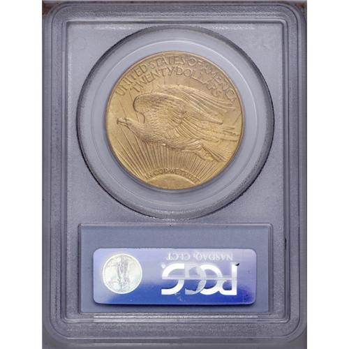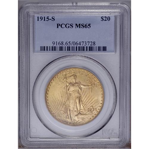 <B>1915-S<$20> MS65 PCGS.</B></I> This satiny and boldly struck Gem is refreshingly void of detectable marks. Subtle apricot and lime shades confirm the originality.