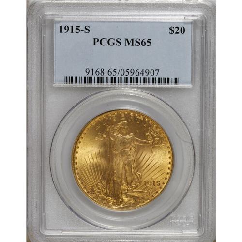 <B>1915-S $20 MS65 PCGS.</B></I> Well struck with smooth, unmarked, matte-like surfaces and lovely, softly frosted mint luster. A tiny rim ding is noted near 3 o'clock on the reverse.<BR><BR><b>Shipping:</b> Coins & Currency (<a target="_blank" href="http://www.heritageauctions.com/common/shipping.php">view shipping information</a>)