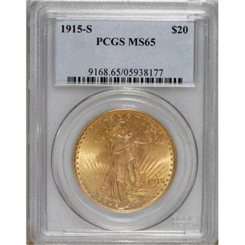 <B>1915-S $20 MS65 PCGS.</B></I> Pale lime and peach endow this shimmering and exactingly struck Gem. Void of unattractive marks, and a small gray spot beneath the eagle's leg is of little concern.<BR><BR><b>Shipping:</b> Coins & Currency (<a target="_blank" href="http://www.heritageauctions.com/common/shipping.php">view shipping information</a>)