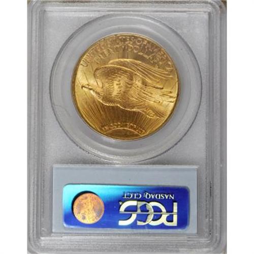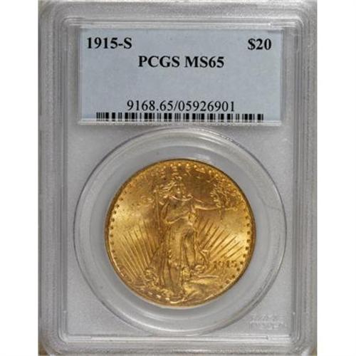 1915-S $20 MS65 PCGS. Rich apricot-gold patination bathes lustrous surfaces on this gorgeous Gem. Exquisite motif delineation results from an attentive strike. A few trivial marks of no consequence.<BR><BR><b>Shipping:</b> Coins & Currency (<a target="_blank" href="http://www.heritageauctions.com/common/shipping.php">view shipping information</a>)
