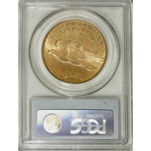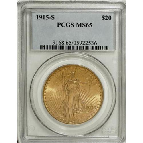 <B>1915-S $20 MS65 PCGS.</B></I> This luminous orange-gold Gem offers a slightly dusky appearance and considerable eye appeal. A well struck San Francisco piece that has a single alloy spot in the left obverse field.<BR><BR><B>Coin Engraver:</B> Augustus Saint-Gaudens<BR><BR><b>Shipping:</b> Coins & Currency (<a target="_blank" href="http://www.heritageauctions.com/common/shipping.php">view shipping information</a>\)