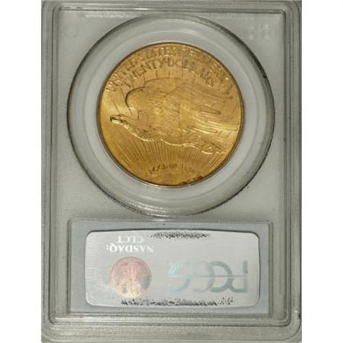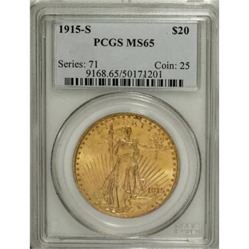 <B>1915-S $20 MS65 PCGS.</B></I> The obverse is satiny, the reverse is lustrous, and both sides display bright orange-gold toning. Crisply struck and impressively unabraded. The reverse border has a slender cherry-wine granular area near 5:30.<BR><BR><B>Coin Engraver:</B> Augustus Saint-Gaudens<BR><BR><b>Shipping:</b> Coins & Currency (<a target="_blank" href="http://www.heritageauctions.com/common/shipping.php">view shipping information</a>)