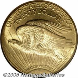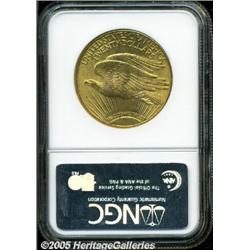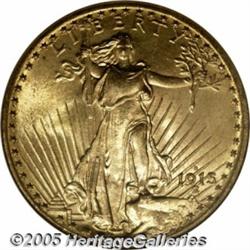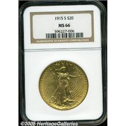<B>1915-S $20 MS66 NGC.</B></I> This splendid Gem is sharply struck with excellent yellow-gold luster. A few tiny abrasions are hidden within the devices. Only one finer example of this issue has been certified to date. Like nearly all examples of this date, the fields have a distinct satiny sheen with subdued granularity. Examples at this grade level are rare, but they are no so rare that acquisition becomes impossible. This is a lovely example for the date or type collector.