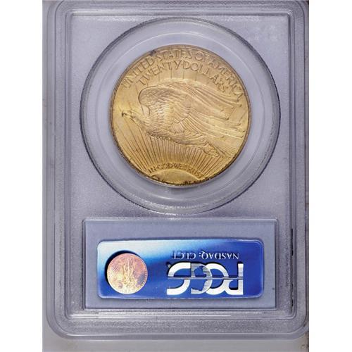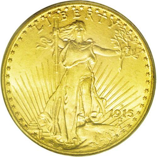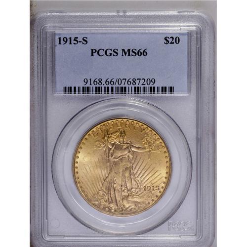 <B>1915-S<$20> MS66 PCGS.</B></I> For the type collector who desires an attractive San Francisco Mint coin, this is an excellent opportunity. Out of 54 issues, David Akers ranked this date as 44th rarest in Mint State, with the 1914-S ranked 45th, and the '16-S ranked 46th. It is these three dates that are clearly the most common double eagles in Mint State grades. He also placed these three dates in exactly the same rank for MS64 or finer grades. This Gem specimen has sharp design details and highly lustrous yellow-gold surfaces. Although a few typical bagmarks are present, it is an exceptional example that will please most any collector.